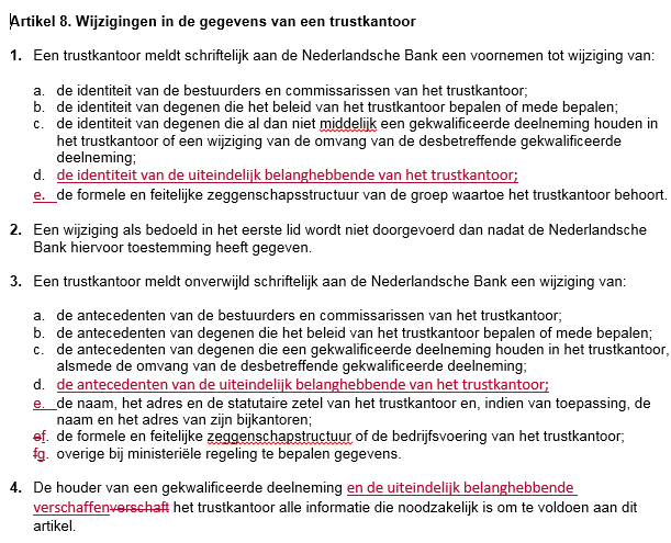In de Wet toezicht trustkantoren 2018 worden artikelen 8 en 10 gewijzigd: