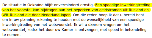 Terwijl er al een Europees ‘Russenverbod’ geldt voor trustkantoren doet het ministerie van Financiën stoer door bij de Eerste Kamer om spoedbehandeling van het Russenverbod wetsvoorstel voor trustkantoren te vragen. Politiek doet het natuurlijk goed om onderstaande onjuiste mededeling te doen: